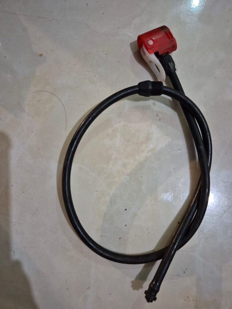 Slang pompa ini menggunakan ulir plastik yang di tutup kedalam ujung slang, ini menggunakan dua fungsi, yang kecil untuk pompa ban model karet pentil di adaftornya dan yang kedua menggunakan pentil ban motor.